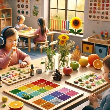 Sensorial development encompasses five key areas: auditory, visual, olfactory, gustatory, and tactile. Auditory skills help children identify sounds, process language, and respond effectively. Visual skills aid in recognizing, recalling, and matching visual information. Olfactory and gustatory senses allow them to distinguish smells and tastes, while tactile development enhances their ability to perceive and respond to different textures and sensations.